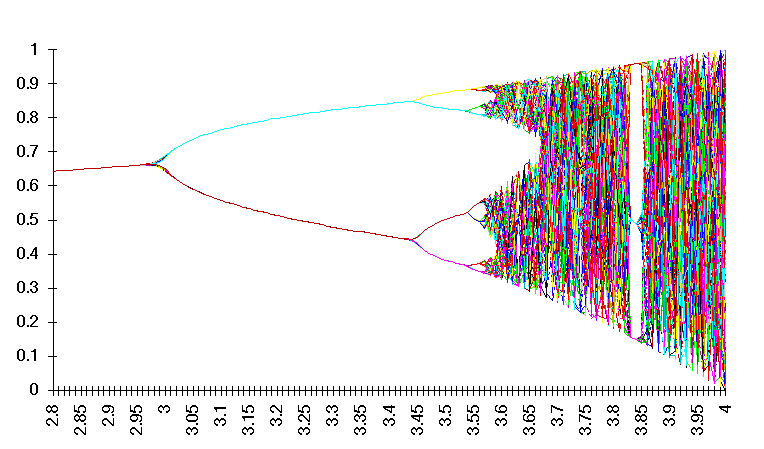 The figure shows a dramatic view of the descent of the equation into chaos. The horizontal axis is "A" - the polynomial coefficient. The vertical axis shows X'. I created the plot with a simple (but huge!) Excel spreadsheet. For A less than 3 or so the result is like that of a traditional function: a single value in results in a single value out. Above 3 the curve forks into two result for each value of A. At about 3.45 the curve forks again, a process that repeats until an infinite number of answers appear. Mathematicians call this repeated forking "period doubling". It's a common characteristic of chaotic systems. Chaos and UsIt's easy to dismiss chaos as a result of Lorenz's odd equation. Few of our systems use equations of this form... or do they? Lorenz's equation is nothing more than a simple second-order polynomial. It's equivalent to: X'=AX-AX2 or, X'=-AX2 + BX + C where A=B where C is zero, though in fact any value of C will give a chaotic result. In other words, for the right (wrong?) values of A, if A=B any iterated second degree polynomial is identical to Lorenz's ill-behaved equation! Further research showed that chaos is a characteristic of non-linear equations of any degree. If your product iterates a polynomial, beware! Iterating is one of the things computers do best, and is a standard part of any programmer's repertoire. Iteration is nothing more than feedback, one of the most commonly-used techniques in analog circuit design. Are we building systems grounded in mathematical quicksand? So, gentle reader, I pose a question: how sure are you that your new product, that instrument using a micro to solve a series of equations, operates in a non-chaotic region? As a mathematics amateur I'll plead ignorance to the fine details of chaos. It's clear, though, that simple equations are rife with scary behavior, behavior we can ignore only at our own (and our customers') peril. I think that our industry needs to examine the implications of this theory for our products. Let's face it: while scores of mathematicians develop beautiful theories to explain and manipulate chaos, we, who write the code that makes the computers iterate, are basically ignorant of its implications. IterationsI invite someone with mathematical authority to email in with an explanation of what sort of conditions we should watch out for. In the meantime I'd be wary of any non-linear algorithm - particularly one that iterates. In a former life I worked on machines that computed the percentage protein in wheat by measuring the amount of IR energy reflected from a grain sample. Reflectances from numerous wavelengths all contributed to the protein result in a complex manner, all combined in a polynomial whose coefficients were determined by a tedious iterative process much like that described above. Quite often the coefficients gave an equation that predicted wildly erratic protein values. At the time we called these "bad calibrations" and blithely advised users to repeat the experiment, but now I suspect the instruments operated on the edge of chaos. In another situation, my former partner and I designed steel thickness measuring equipment. The units were self-calibrating: the software tossed various known thicknesses of steel into the x-ray beam, and then computed a least squares solution to a polynomial which would predict the thickness of any piece of the same material. Though the system worked pretty well, it was horribly sensitive to changes in practically any parameter. Not supplying enough known-thickness pieces resulted in crummy predictive powers of the polynomial, as did any tiny error in the standards. We developed empirical procedures that generally resulted in good results... but never understood the why behind the what. Now I wonder how much sense it makes to let a system automatically compute coefficients of a polynomial of two or higher degree. If you know the coefficients then you can probably model the system to see if there is a tendency to degenerate into chaos. When the computer picks the coefficients, anything goes. Just how does one go about modeling potential chaos? I've been building simulations using spreadsheets. For a polynomial like Lorenz's this is easy: put slowly increasing hard-coded values of A along the columns, and then iterations down the rows. Plot the columns and look for values that do not converge to a single answer. It's a bit harder to do this for equations of higher degree with so many more coefficients. Perhaps a better approach is a simple C simulation of the equation that looks for chaos as the coefficients are diddled around the values the system will use. I'd be wary of running this experiment on a Pentium! Offload the divisions to a coprocessor... or even a software floating point emulation running on a good old reliable 8051. Those pesky Pentium division problems will seed all sorts of errors into your results. QuestionsAny non-linear system could be chaotic. Reference (3) includes a chapter about predicting chaos, but it's far over my head. I invite responses from anyone having experience or thoughts about this. A collerary of this could be: how close can we ride to the edge of a known chaotic condition. In the case of the Lorenz equation it's just a matter of knowing at what point A causes the system to degenerate. When two, three or more variables are involved, what do we do? At the risk of admitting even more ignorance, some day I'd like to understand the process of how a system falls into chaos. If you maintain 80 bits of floating point precision, can the system stand twice the iterations as with 40 bit precision? I'm looking for an infinite-precision BCD math package that will let me study this. I'll report on the results... when there are some. Know-it-AllsI advise every embedded software person to start studying chaos. Given that it has such profound effects on even the simplest equation, there's a chance you could spend a lot of time fighting what appear