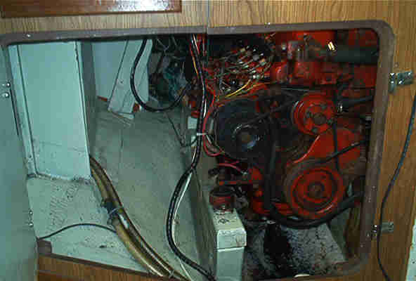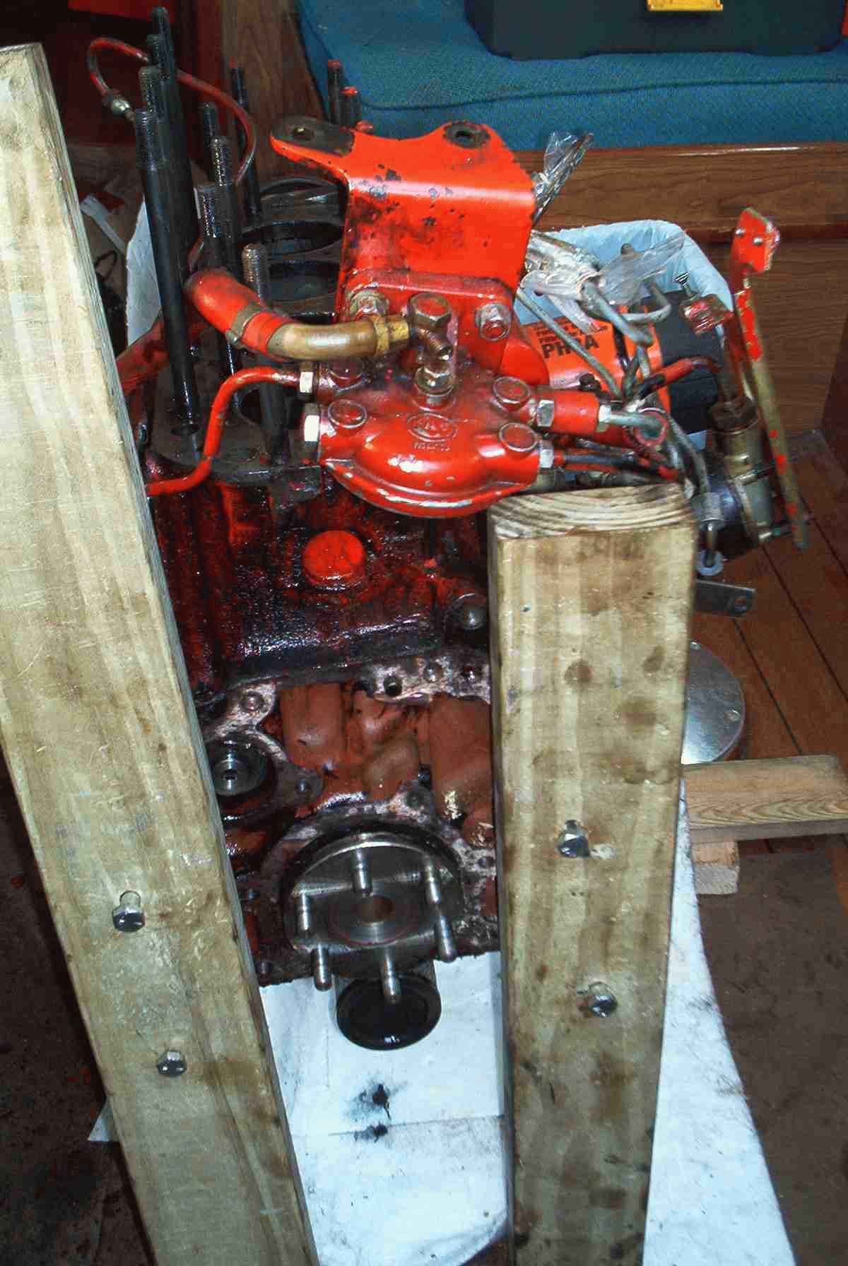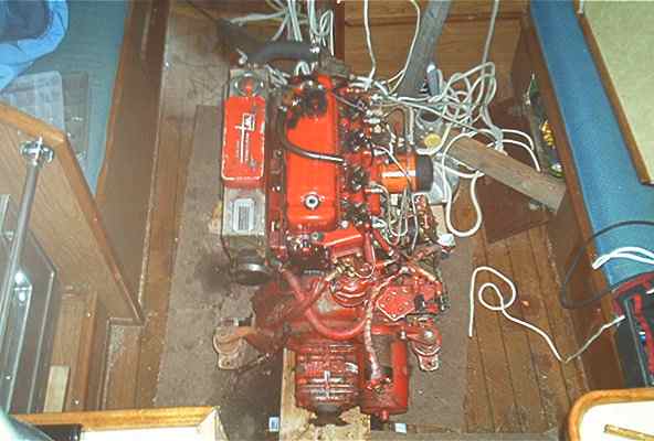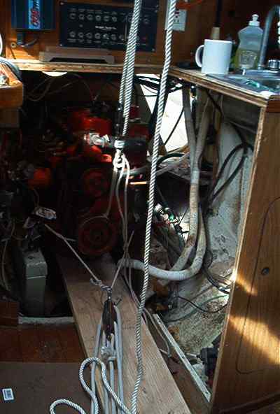 Engine in the main cabin. You can't see a box we built from a 2x10 under the forward end. The two front engine mounts rest on it to keep the engine up off the cabin sole, and to keep it from falling over.