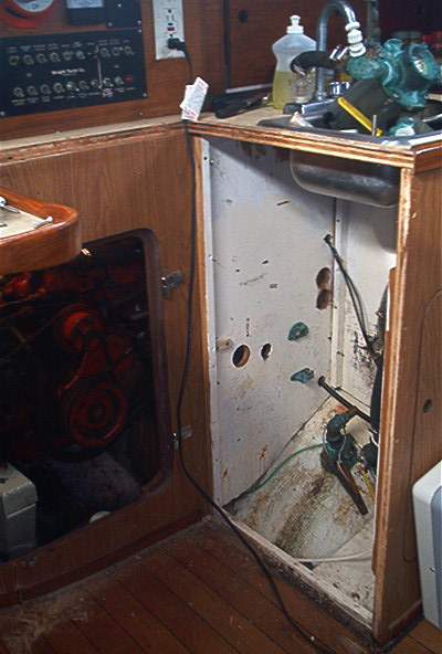 First, I removed the panel under the sink adjacent to the ladder. Though this might not have been totally necessary, it cleared a lot of room for the engine removal. It also meant all of the under-sink plumbing (a LOT) had to come out. My plan is to reinstall this panel with quick-removal fasteners to facilitate access to the plumbing. There's hot and cold water hoses to the sink, a cold water line to the manual sink pump, and a 3 way valve (plus a demand pump) that feeds sea water to the sink's hot water faucet when at sea (having a pressure sea water line saves an awful lot of freshwater). The engine's sea water strainer lives down here as well.