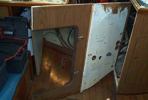 Then the bulkhead between the engine room and the main cabin came out. Some Seawind owners cut out the entire panel; instead I made two small cuts about in the midships of the boat, on the upper and lower parts of the bulkhead, and unscrewed the rest of the thing.