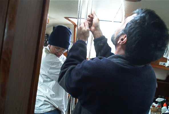 We then slid a 2x10 under the engine and into the main cabin. A cross-brace that went into lockers port and starboard in the main cabin prevented the 2x10 from tilting up. A tackle on the engine pulley going to the main boom (with the main halyard counteracting this pull) provided some upward lift. Another went out the forward hatch, to the foredeck mooring cleats. We pulled on both tackles to lift and move the beast forward. The weight is unbelievable, but a few minutes of pulling started things moving.