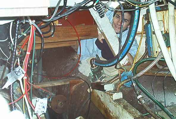 I disconnected everything, wires, plumbing, fuel lines, labeling as required. The prop shaft is inaccessible but Graham, my 14 year old, went into the port cockpit locker and unbolted the coupling.