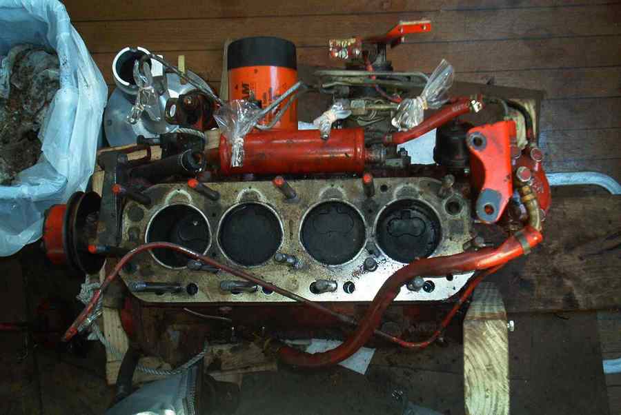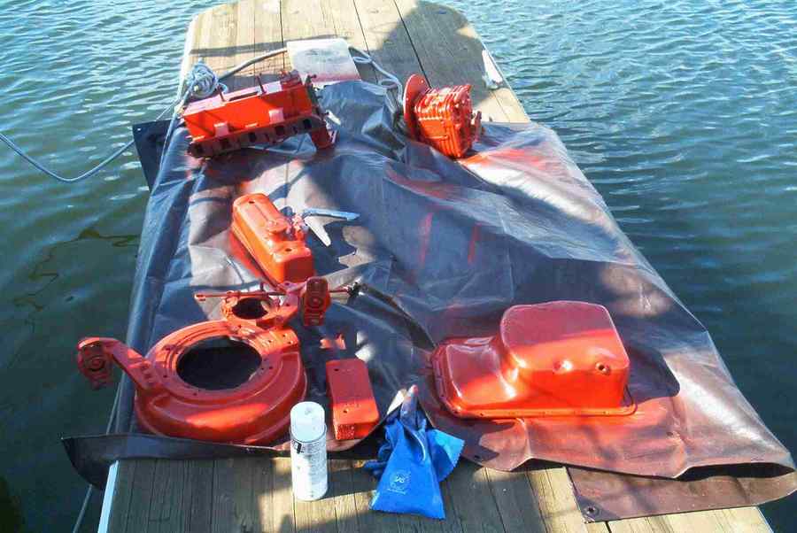 The engine was a greasy, rusty, mess. I removed most parts: starter (sent to be rebuilt), heat exchanger (ditto), manifold, oil pan, transmission, bell housing, etc, degreased them, and painted them, using Rustoleum primer and Westerbeke red paint. It took two cans of red, using 3-4 coats depending on how bad the part was..