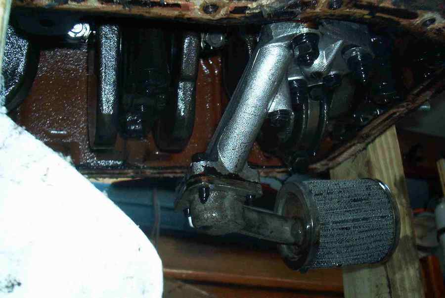 Crankshaft and oil strainer, looking up into the engine from underneath.