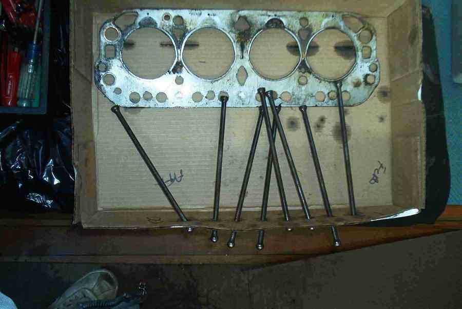 Pushrods and head gasket. Note the pushrods are stuck in cardboard so I know which one goes where when it comes time to reassemble things.