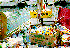Amber's stern settled a few inches as we piled it in her cockpit while stowing it all below. A French photographer stopped to take pictures of the mounds of supplies. Every time we provision for a long voyage I despair of finding room for it all, and am amazed that somehow every item disappears into a locker.