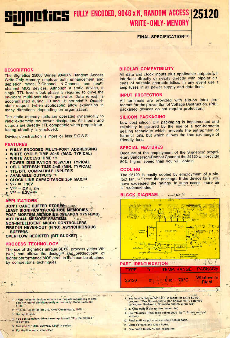 Want to increase your team's productivity? Reduce Bugs? Meet deadlines? Take Jack's one day Better Firmware Faster seminar. You’ll learn how to estimate a schedule accurately, thwart schedule-killing bugs, manage reuse, build predictable real-time code, better ways to deal with uniquely embedded problems like reentrancy, heaps, stacks and hardware drivers, and much, much more. Jack will be presenting this seminar in Chicago (April 23, 2008), Denver (April 25) and London, UK (May 19). Want to be your company’s embedded guru? Join us! More info here. For hints, tricks and ideas about better ways to build embedded systems, subscribe to The Embedded Muse, a free biweekly e- newsletter. No advertising, just down to earth embedded talk. Click here to subscribe. Write Only MemoryIn 1972 Signetics recognized April Fools day by printing a full color datasheet for a Write-Only Memory. This is a chip which accepts data but never reads it back. Suggested uses include a data logger for bombs. Graphs show "number of pins left versus number of insertions" and other useful data. A couple of pins are dedicated to 6.3 volt AC input... for the filaments, of course! A scanned version is here (page 1) and here (page 2) (these are 150k .JPGs).